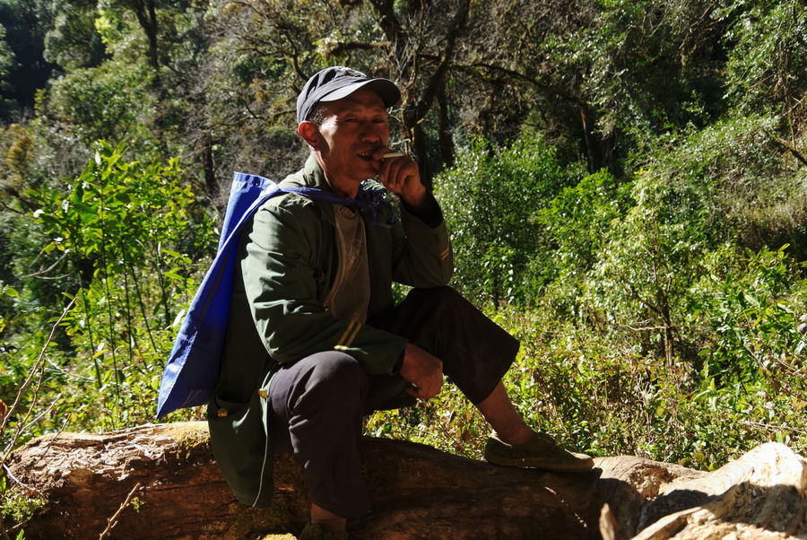 Chargement du thé...Si l'accès à zone restreinte autour du sommet où se trouvent les plus beaux spécimens de théiers sauvages est ainsi limité, la forêt de Da Xue Shan ne s’arrête cependant pas là et s'étend du Nord au Sud sur toute la crête de la montagne, et on trouve un peu plus loin du sommet de nombreux théiers sauvages que les locaux continuent aussi à cueillir comme le faisaient leur ancêtres et qui font le bonheur des amateurs de théiers sauvages. De par leur relative rareté ces thés seront soit vendus en vrac (maocha), soit compressés par différents producteurs pour en faire des galettes, souvent en quantité limitée. Nous aurons l'occasion d'en goûter quelques uns plus loin lorsque nous aborderons en détails les théiers sauvages de Da Xue Shan.