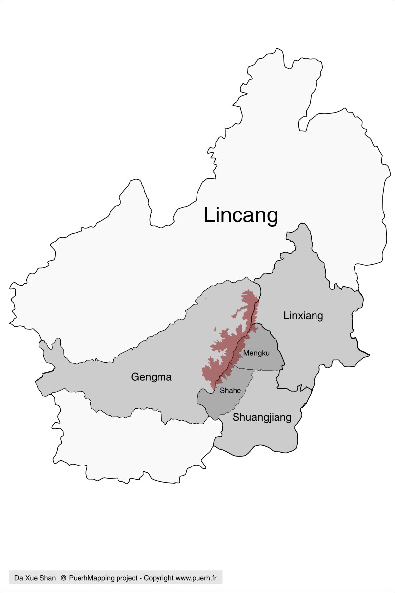 Mengku est une vallée orientée nord-sud, normée par deux frontières naturelles. A l'est la montagne de Da Hei Shan qui sépare la vallée de Mengku de celle de Boshang et forme le terroir de Mengku Est (Dong Ban Shan, littéralement moitié est). A l'ouest Da Xue Shan, qui sépare Mengku de Genma (耿马) et qui forme le terroir de Mengku Ouest (Xi Ban Shan). A l'intérieur de Mengku on parle donc assez peu de Da Xue Shan, et on préfère l’appellation de Xi Ban Shan (moitié ouest de Mengku), bien que les deux appellations se réfèrent à la même montagne.