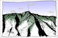Là où autour de nous se dessinait initialement un dense fouilli graphique de mousses et de branchages, semble progressivement se redéfinir les échelles et la hiérarchie de la forêt. La folle végétation se calme pour laisser place aux immenses arbres qui depuis des millénaires règnent sur la montagne. Ces arbres aux dimensions vénérables donnent le vertige. Tandis qu'ils s’élancent vers le ciel et que leurs branches donnent à la foret un toit, il nous faut étirer nos cervicales et se tordre comme une liane pour en suivre des yeux les troncs, avec la frustration de ne jamais ne pouvoir voir l'un d'eux en entier, donnant à ces lieux une dimension irréelle.