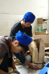 The thong is then passed to a second worker (left) who placed third grass (in the third cake) while that the first worker resume the steps we have just seen with a new stack of pancakes.
